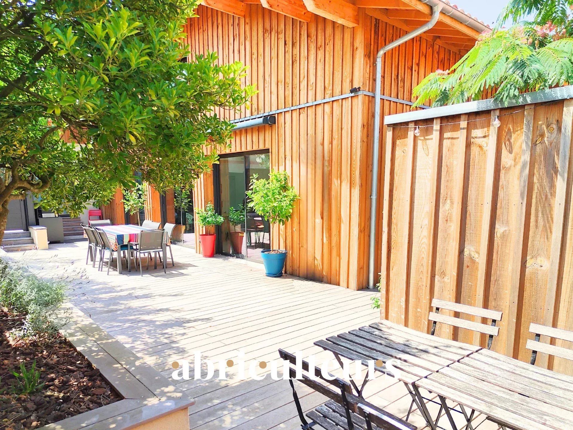 Vous profiterez d’une terrasse en bois exotique de plus de 100 m², orientée sud / sud-est, entourée d’essences méditerranéennes, de jasmins et d’arbres fruitiers.