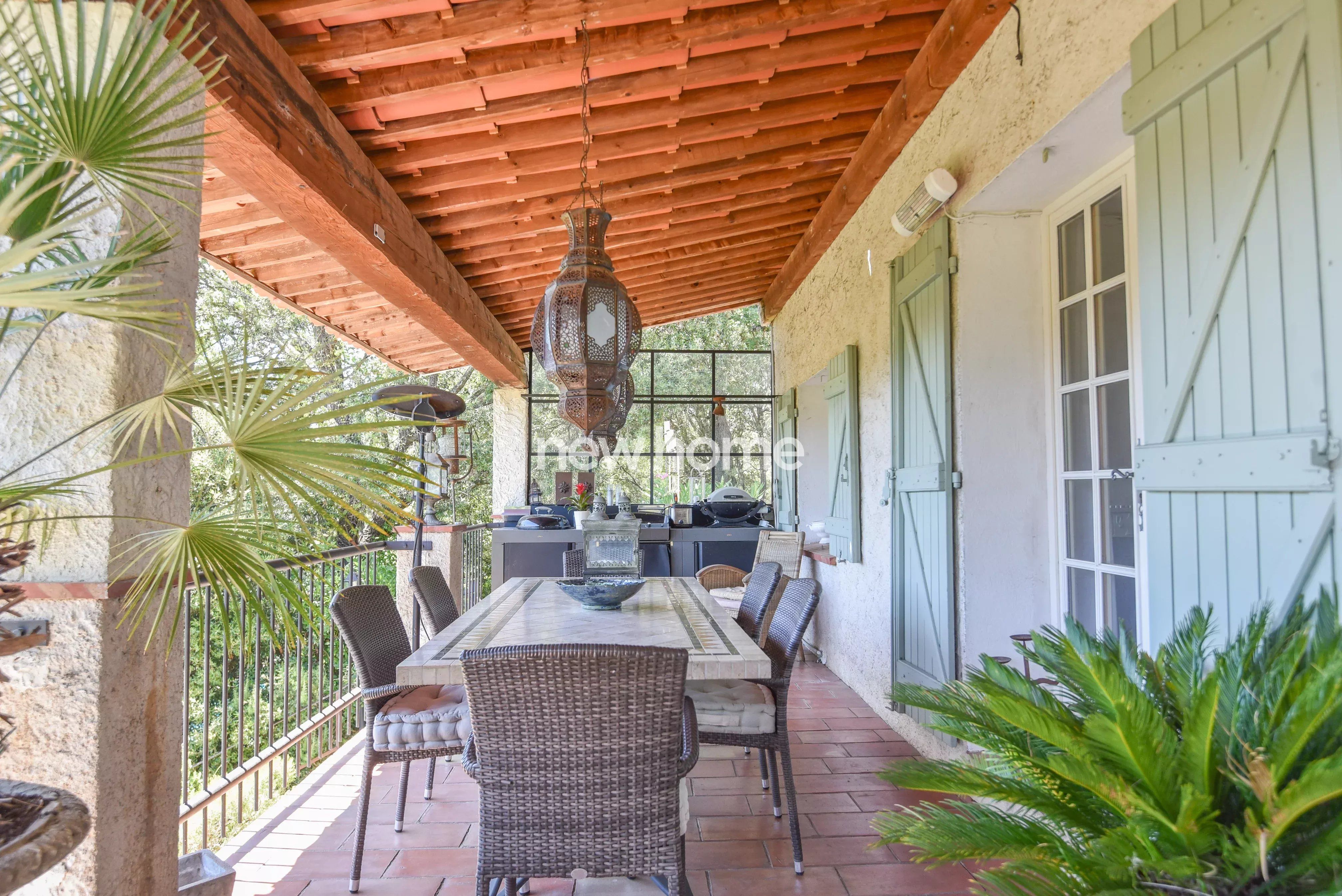 Cette maison pleine de charme est située dans un endroit calme. La superbe véranda qui attire dès l'arrivée le regard est un véritable atout pour cette maison. Autour de la maison, plusieurs terrasses vous permettent de choisir entre soleil et ombre selon vos envies. Pour les passionnés de peinture ou autres activités créatives, un superbe atelier avec une belle luminosité est à votre disposition. À l'intérieur, l'aménagement est soigné et raffiné, avec de jolis détails tels que les puits de lumière dans le séjour, la rampe d'escalier en fer forgé, ainsi qu'une belle cuisine ouvrant sur la grande terrasse.
