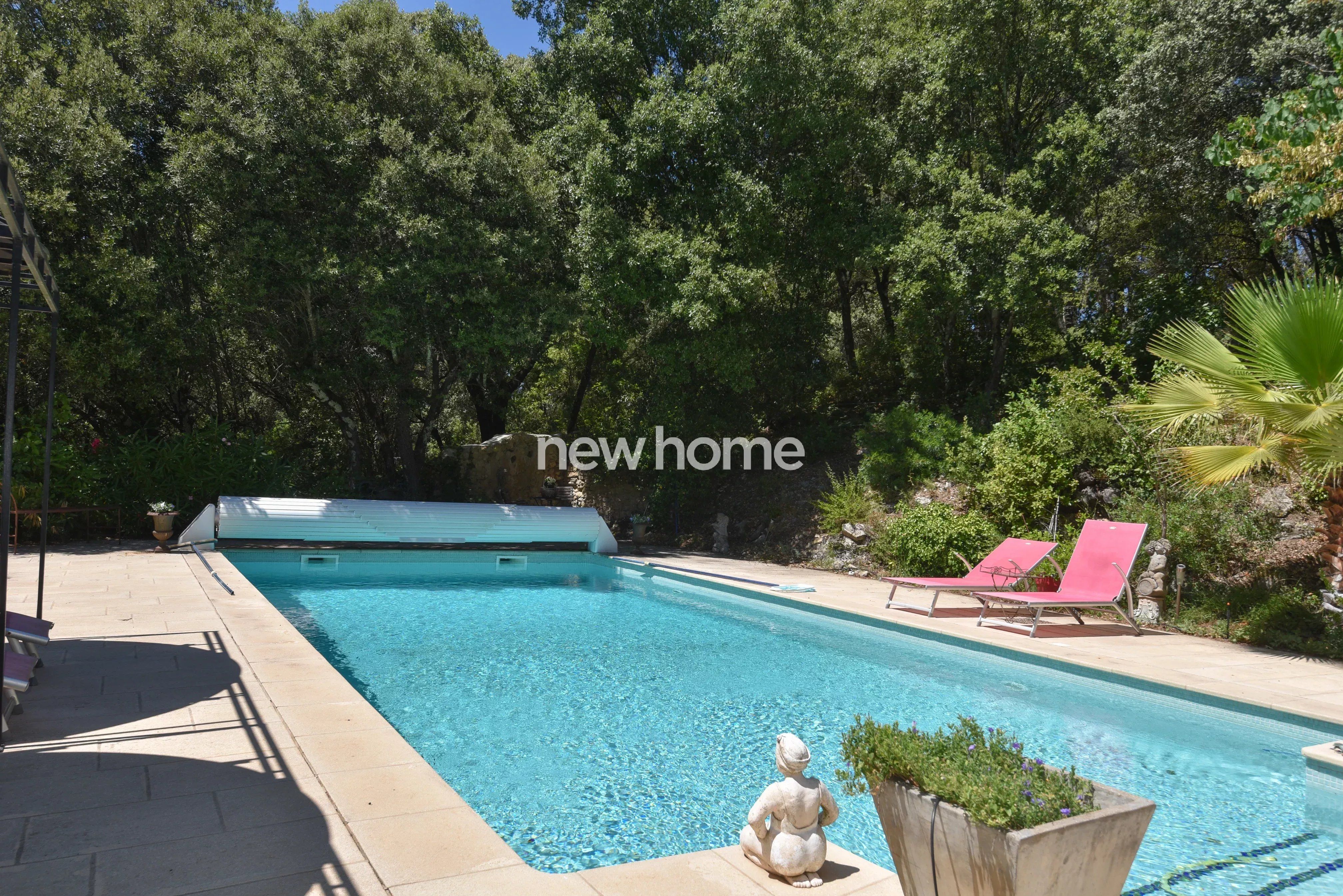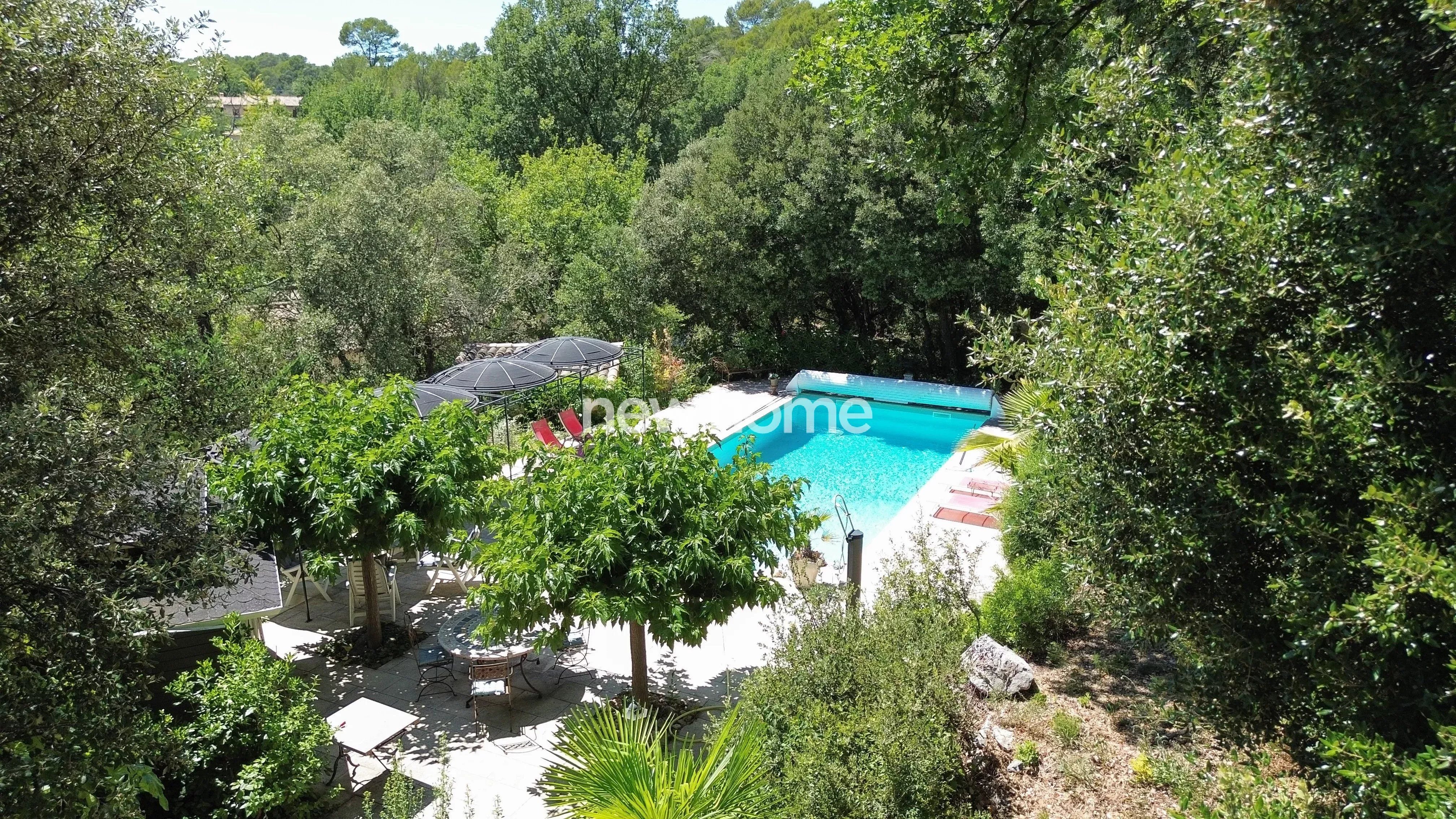 La piscine de belle taille située en contrebas (10 x 5 et 2m de profondeur) s'accompagne d'un charmant chalet avec sauna, offrant tous les ingrédients pour la détente. Plusieurs places de parking ainsi qu'un abri voiture sont à disposition également.